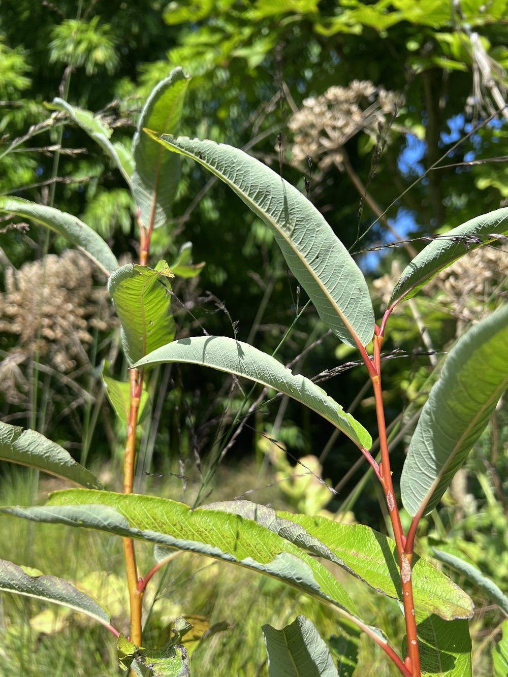 A really rather different ornamental willow, having deep red stems in winter and rich green, large, lanceolate leaves with glaucous undersides and red petioles. Collected by Keith Rushforth on Zi Ben Shan, Yunnan, at c3100m. A hardy large shrub to small tree.