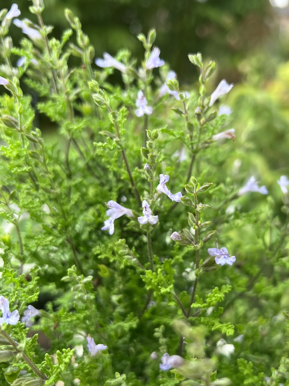 A particularly pretty and most un-sage-like sage from South Africa with highly fragrant curly-wurly teeny-weeny little leaves and a long season of tiny bright blue flowers through summer and autumn on an evergreen shrub to a maximum of 1m tall. Not completely winter hardy in the UK so bed out for long summer interest or grow in a pot overwintered under glass etc, unless you are mild. Well drained soil in full sun.