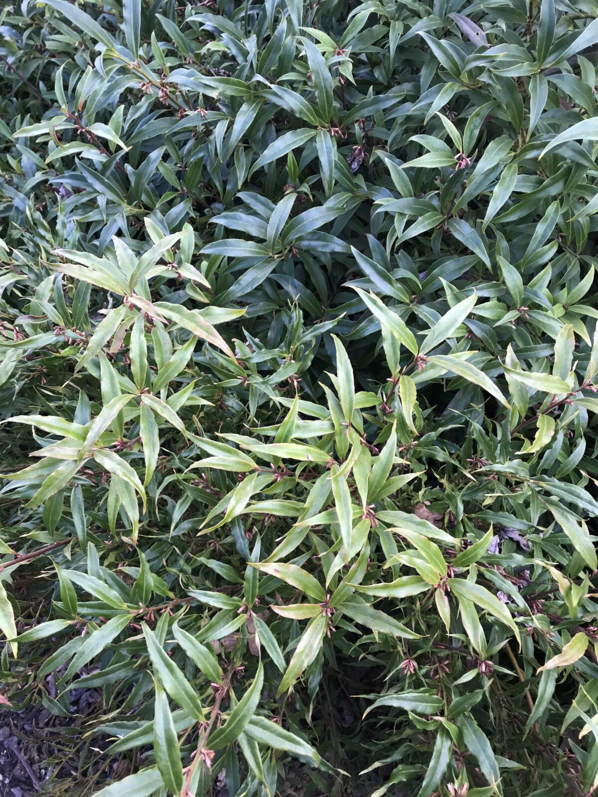 A small evergreen shrub and one of the finest forms of Christmas Box, with long, narrow foliage on rich-purple stems and pink-tinged white flowers; small, but very sweetly scented and borne in profusion in the middle of winter, usually February, when wafts of honey-sweet fragrance fills the garden. Best positioned near your front door or somewhere you'll pass in winter, where you'll get the full benefit. Shade and drought tolerant, but also fine with half a day of sun. A tough, tolerant easy shrub for most soils. To 1.5m tall.