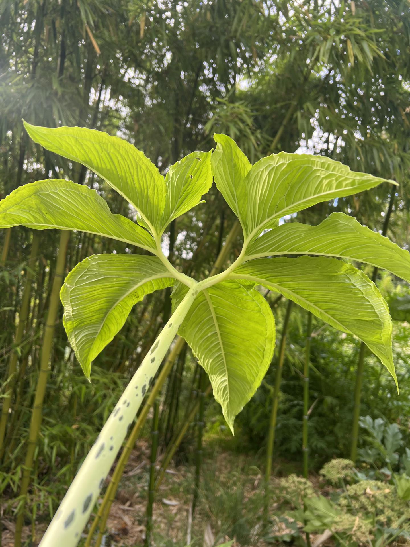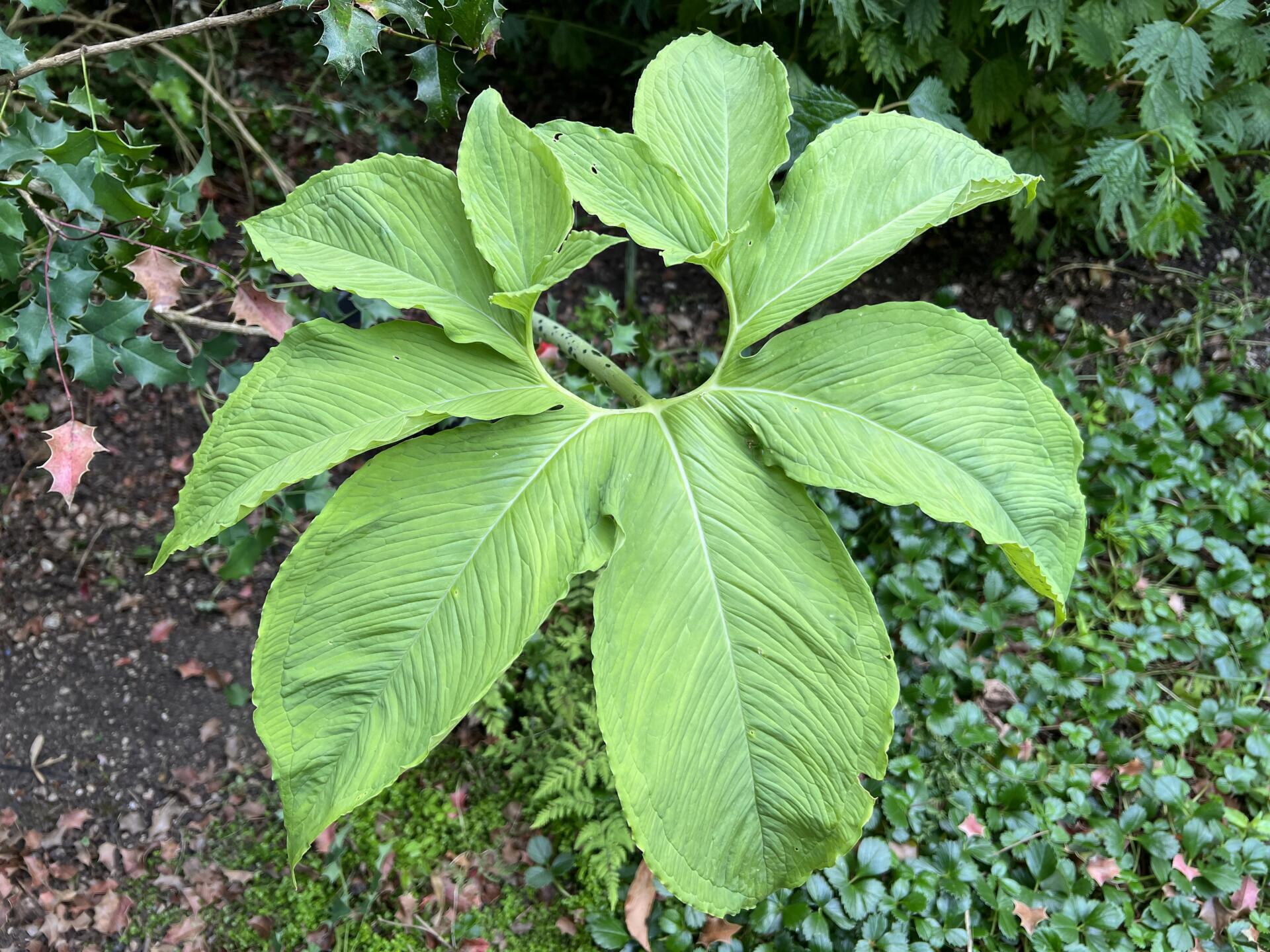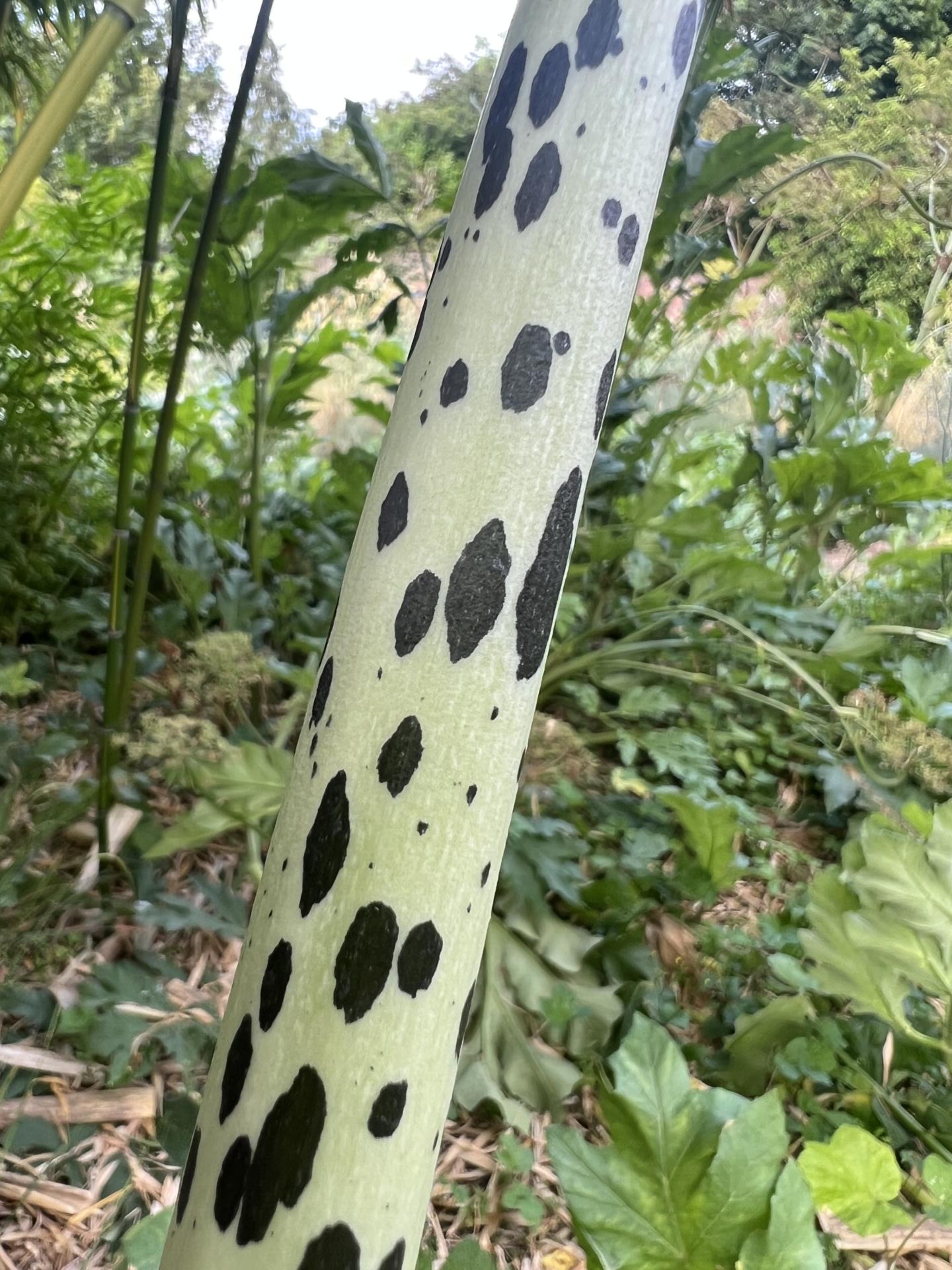 Bigger in all its parts than the usual 'Voodoo lily' and with better markings, this Asian aroid is grown for foliage and leaf stalk (petiole) effect, with the handsomely veined leaflets topping the upright petiole up to 1m across if exceptionally happy (moist and shaded). The petiole is palest light-green with well spaced large dark blotches and is a joy in itself. The early summer exotic-looking maroon flower, at ground level, smells like shit for one day only, but is highly attractive, both visually and to flies. Hardy.