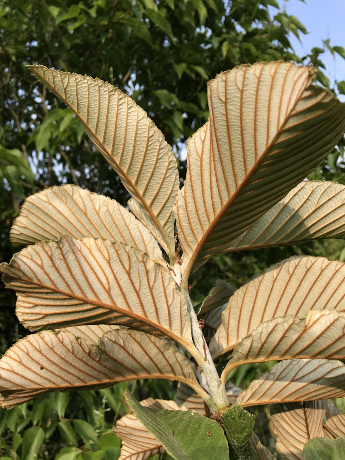 A distinctly narrower crowned form, but not remotely fastigiate, selected from a batch of his own Bhutanese wild source trees by Keith Rushforth himself. This would make a superb street tree or small to medium sized garden tree where space is restricted. As usual the leaves are large with vivid white undersides and superb contrasting bronze veins, epsecially on early growth. Tough and easy. A superlative whitebeam, yet rarely offered.