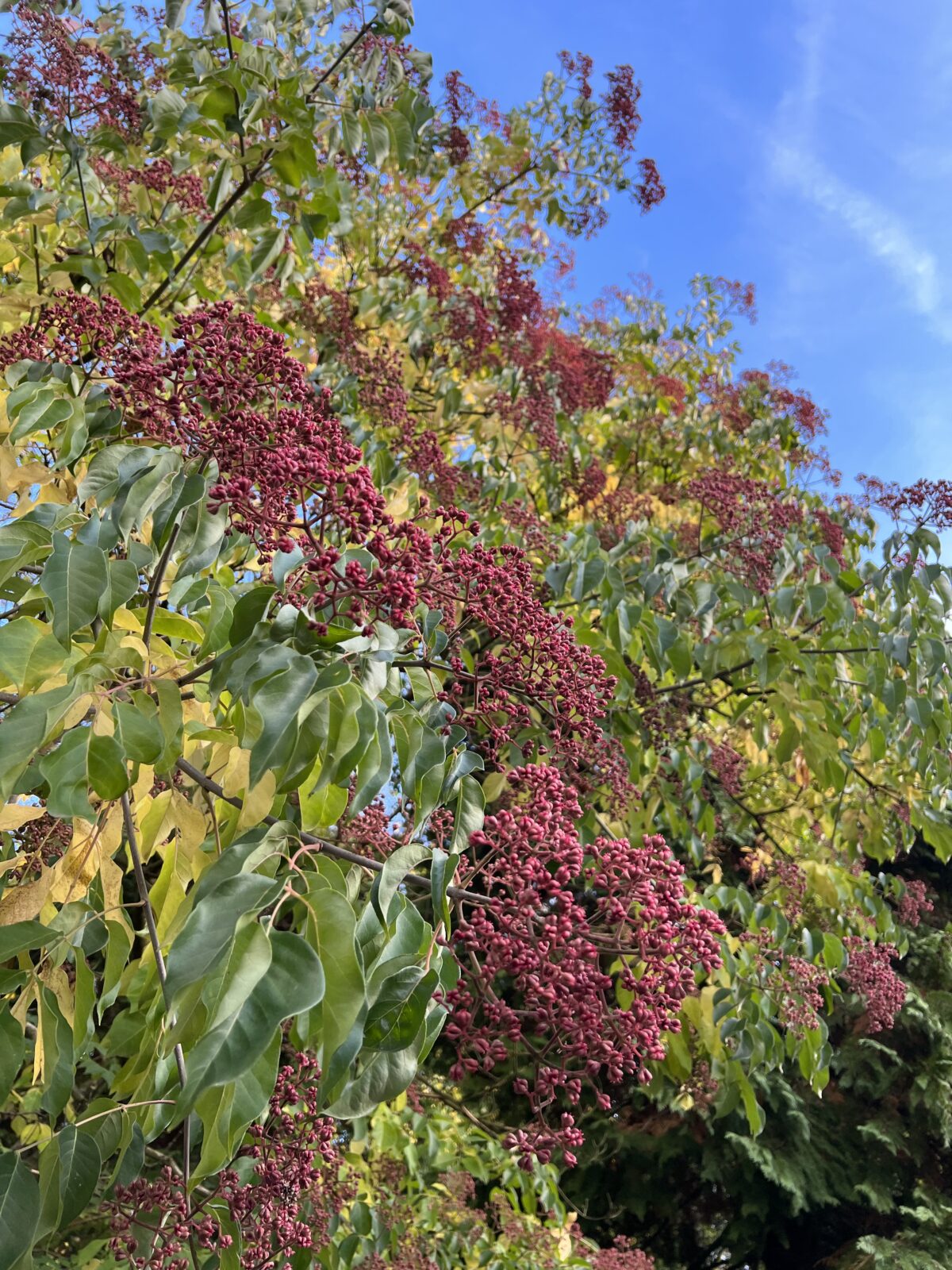 A neglected but invaluable fast growing small to medium sized hardy tree from the Far East. Corymbs of flowers borne in late summer/early autumn, creamy white, pungently scented and attractive to all manner of beneficial insects, giving way to fat clusters of very conspicuous deep-red seed capsules as the leaves turn to light yellow. Attractive pinnate leaves and smooth grey bark. For most sites and soils.