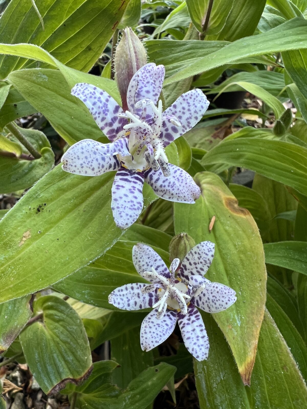 Toad Lily. In this form the dark purple spots are very distinct against white petals. Attractive foliage, arranged in an alternate ladder-like fashion up the stems with the orchid-like flowers produced in each leaf axil. Height 60cm; shorter and more arching in habit than most T. hirta. An easy perennial for shade, not too dry.