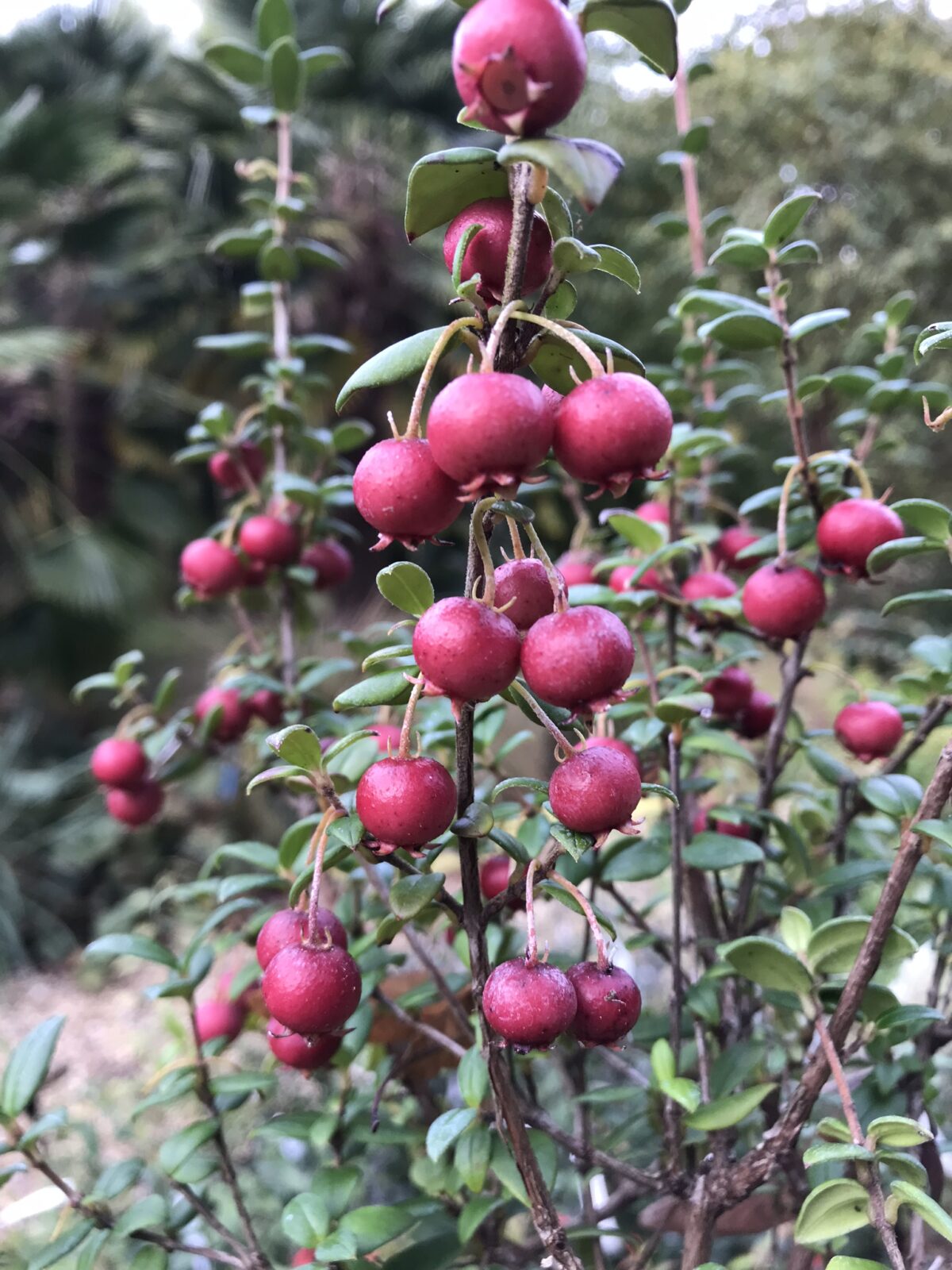 A selected form of the marvellous 'Chilean Guava'. Previously known as Myrtus ugni, this little Myrtle inhabits woodland and scrub in S. Chile and is reasonably hardy here, forming an erect evergreen shrub to about 1.5m high, with tiny leathery leaves and very pretty, waxy, soft-pink bells followed by delicious mahogany-red fruit, tasting like sweets. In cold areas needs wall protection.