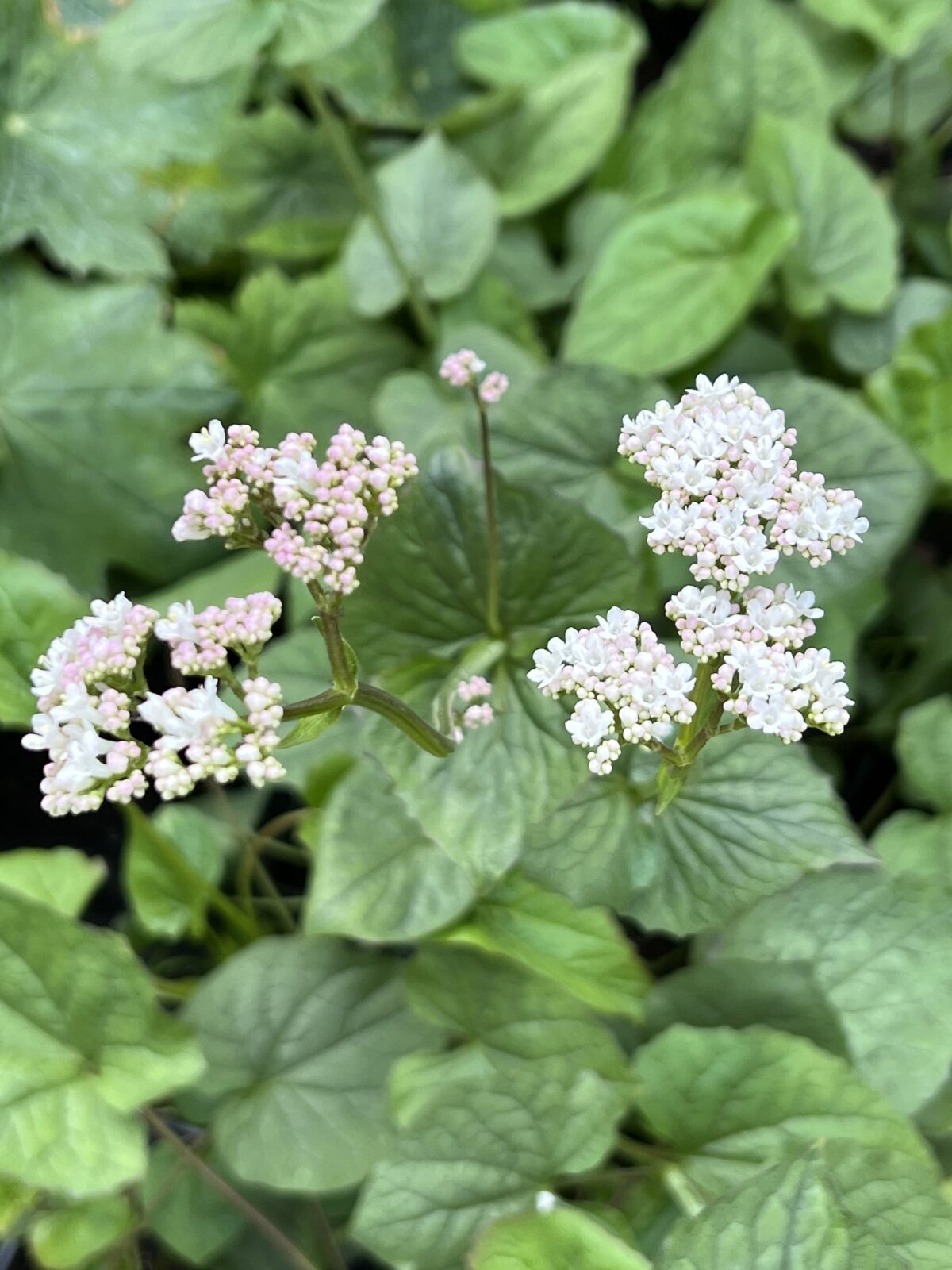 White flowers from palest-pink buds rise above the foliage on slender stems in late spring/early summer. Leaves are bold, cordate (heart shaped) and slightly grey-green. A hardy Caucasian perennial collected originally in Georgia. A species widely confused with V. tillifolia in cultivation, which has larger green leaves. For sun or semi-shade, not too dry.