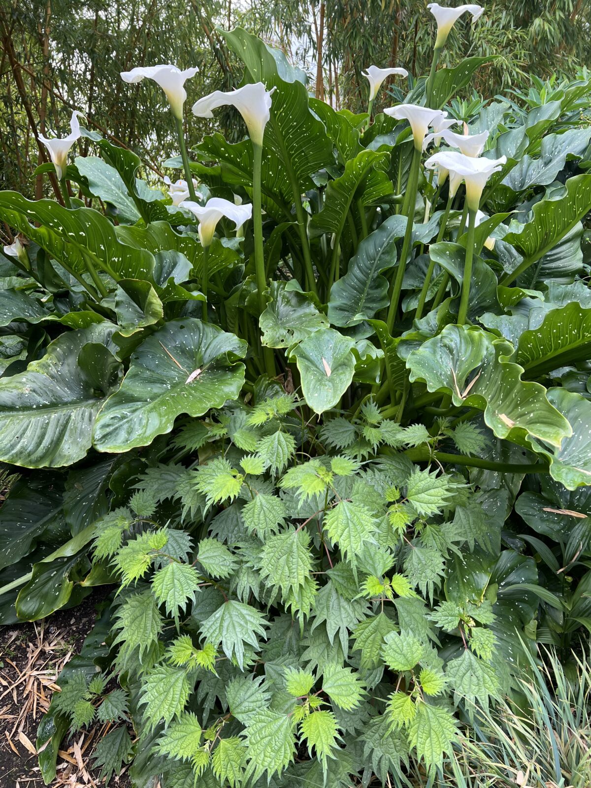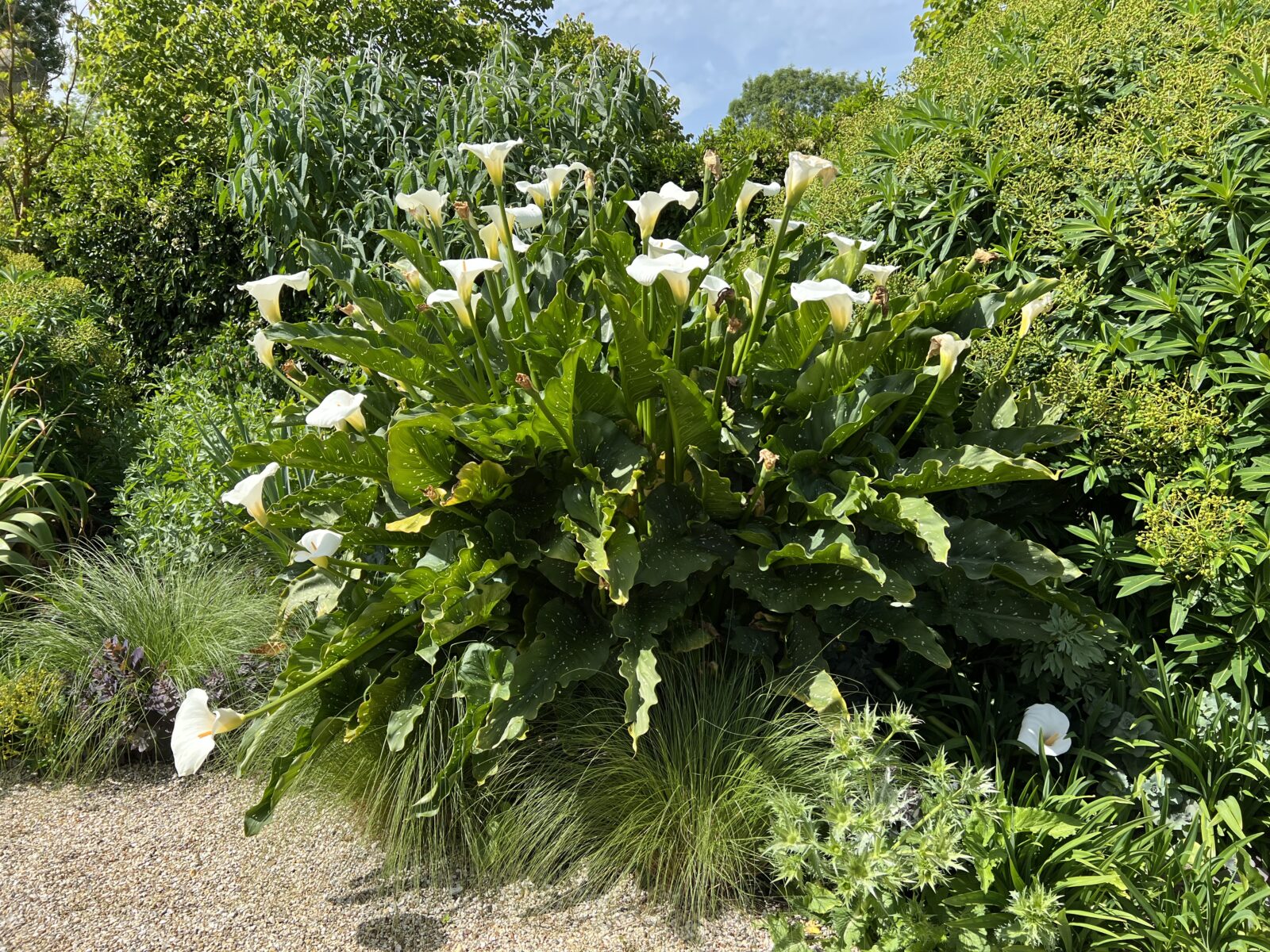 A truly giant hybrid Arum lily with huge white-speckled green foliage reaching up to 1.5m high and large white spathes on stalks to 2m! This will reach its largest proportions in a moist site (or water), though you'll find it easy in any site, dry or wet. Quite magnificent. Introduced and previously distributed as 'White Giant'.